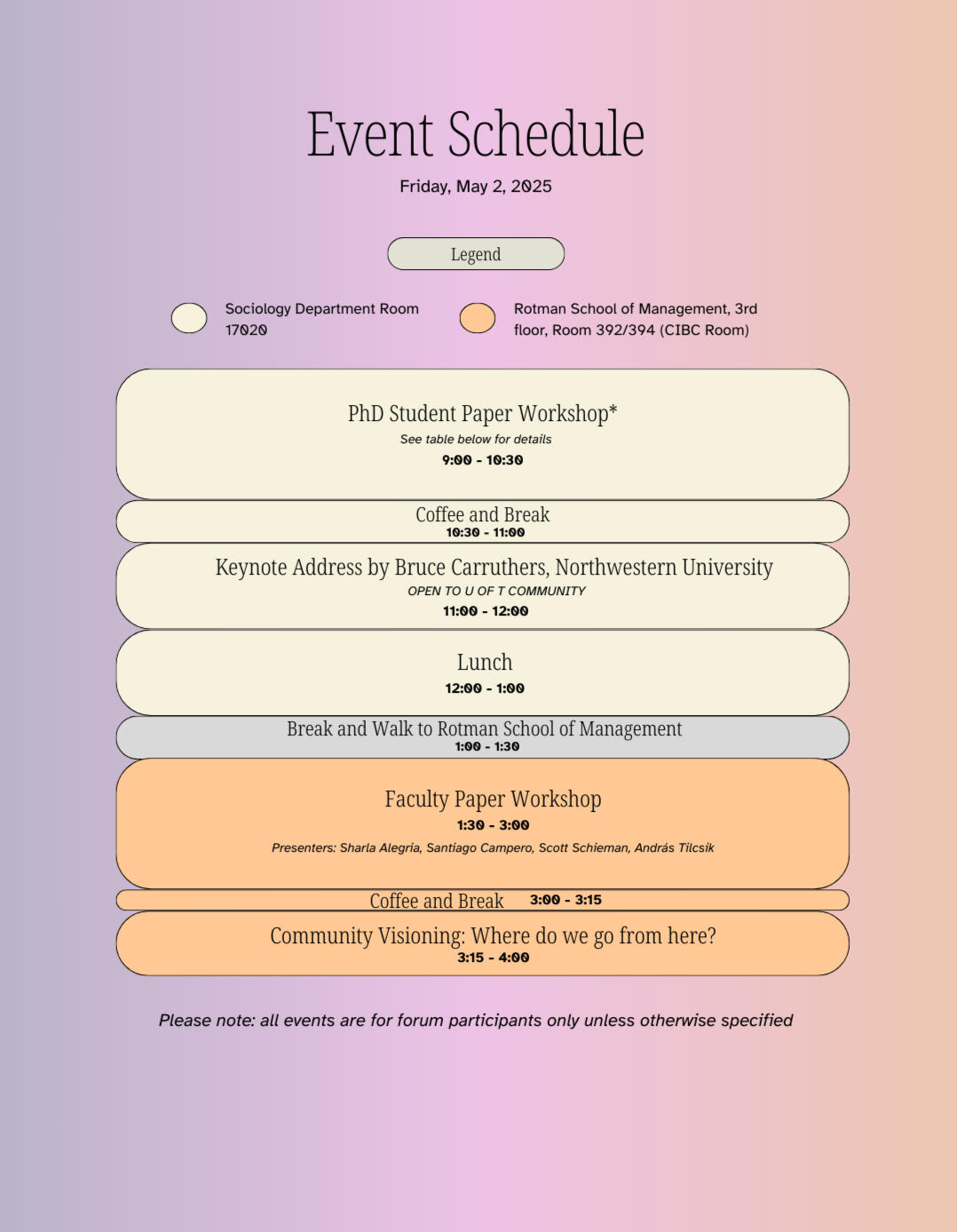 From 9:00am to 1:00pm, we will be located in the Sociology Department, room 17020.We will walk to the Rotman School of Management at 1:00pm.From 1:30 - 4:00pm, we will be located in the Rotman School of Management, 3rd floor, room 392/394 (CIBC Room).